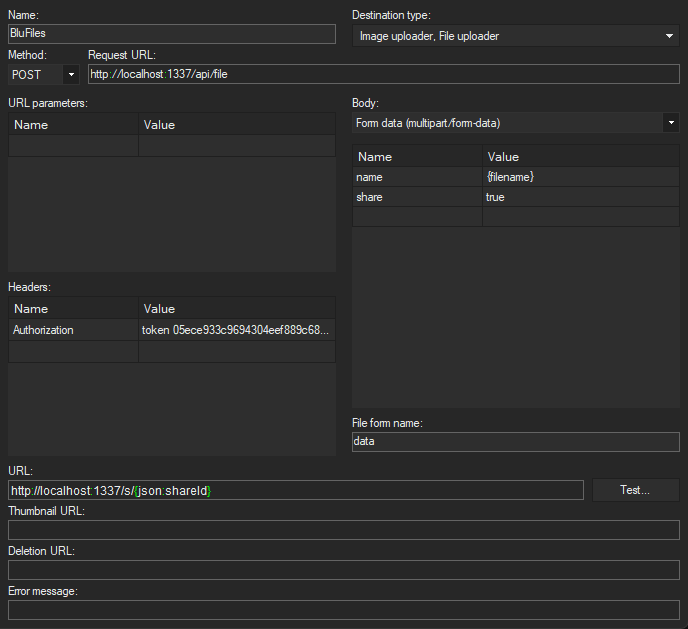 BluFiles has an integrated snippet generator which can automatically generate a custom ShareX uploader for you based on your API token. See the Generating Snippets guide for more information on this.