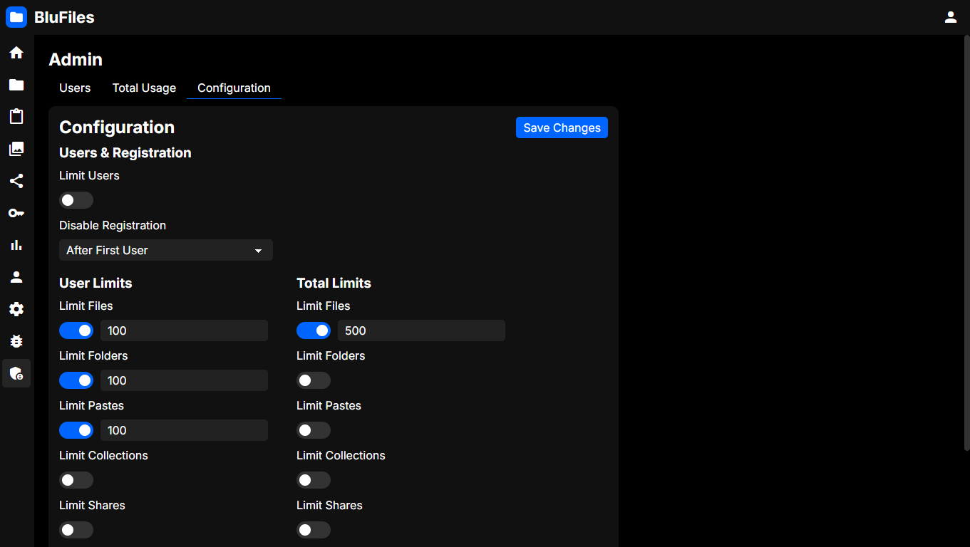 Here you can configure some settings for your BluFiles server, such as user registration and usage limits.