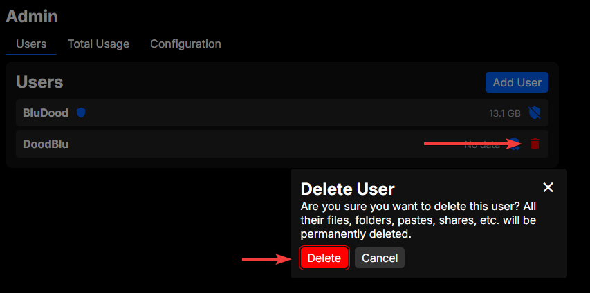 To delete a user, click the trash icon on the right side of the user you want to delete. You will be prompted to confirm the deletion, and once you confirm, the user will be deleted along with all of their files, pastes, and collections.