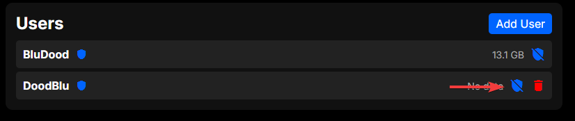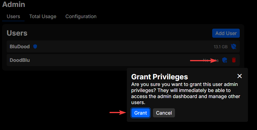 To make a user an administrator, click the shield icon on the right side of the user you want to grant privileges to. You will be prompted to confirm the action, and once you confirm, the user will have administrator privileges.