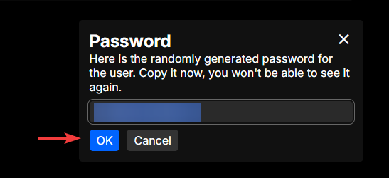 To create a new user, click the "+" icon in the top right of the page. You will be prompted to enter a username for the new user, and a random password will be generated for them. You can copy the password and share it with the user, as they will need it to log in.