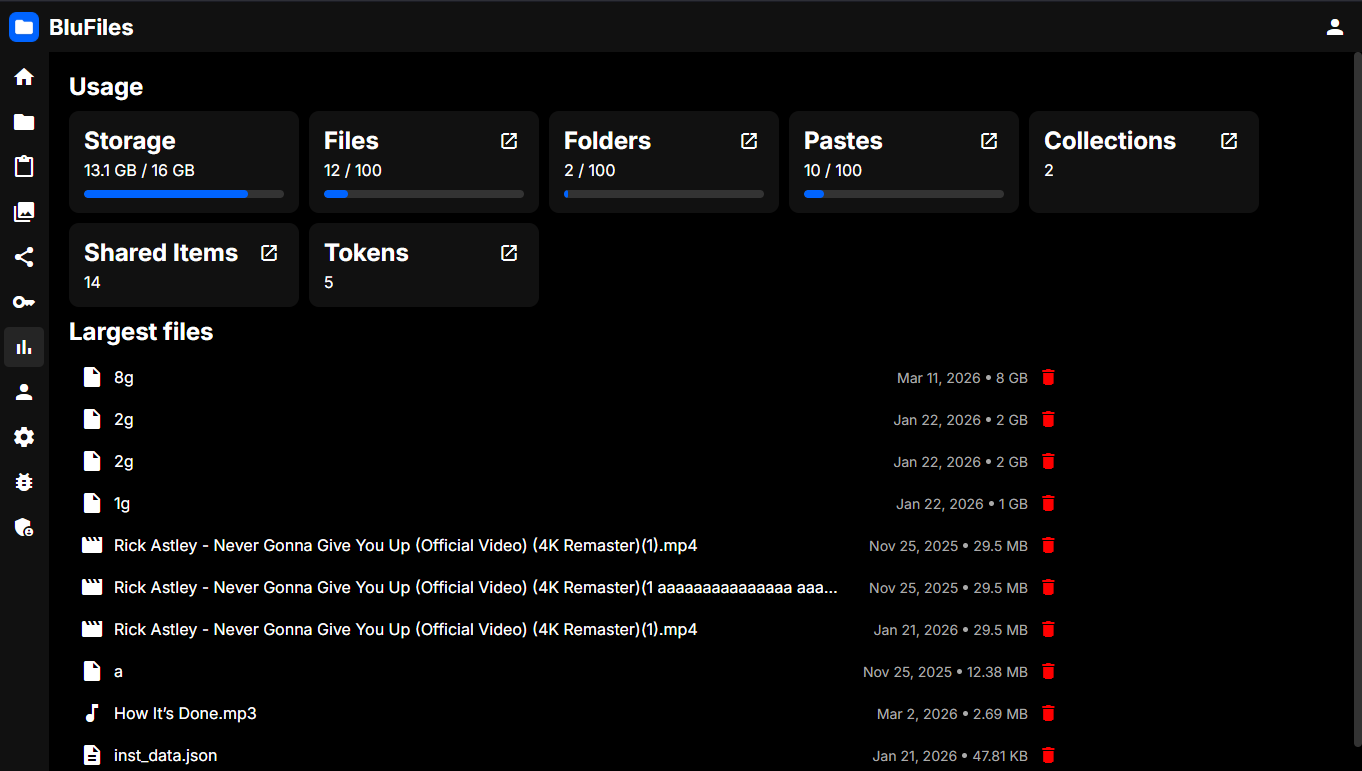 In the "Usage" section, you will see an overview of your own usage of storage, amount of files, pastes, etc. You will also see your max limits if the admin has set any.